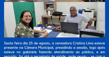 Sexta feira dia 25 de agosto, a vereadora Cristina Lima esteve presente na Câmara Municipal,…